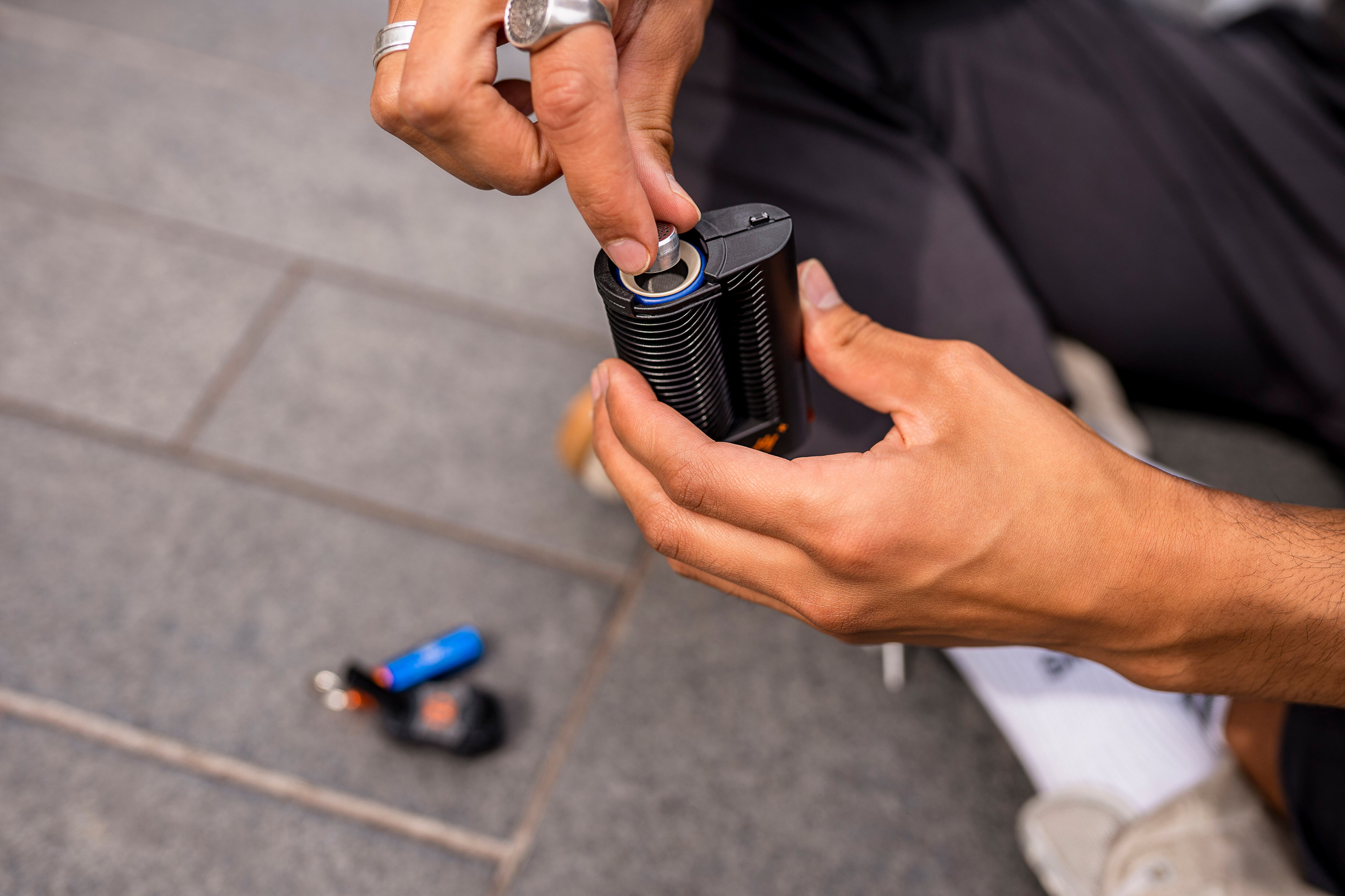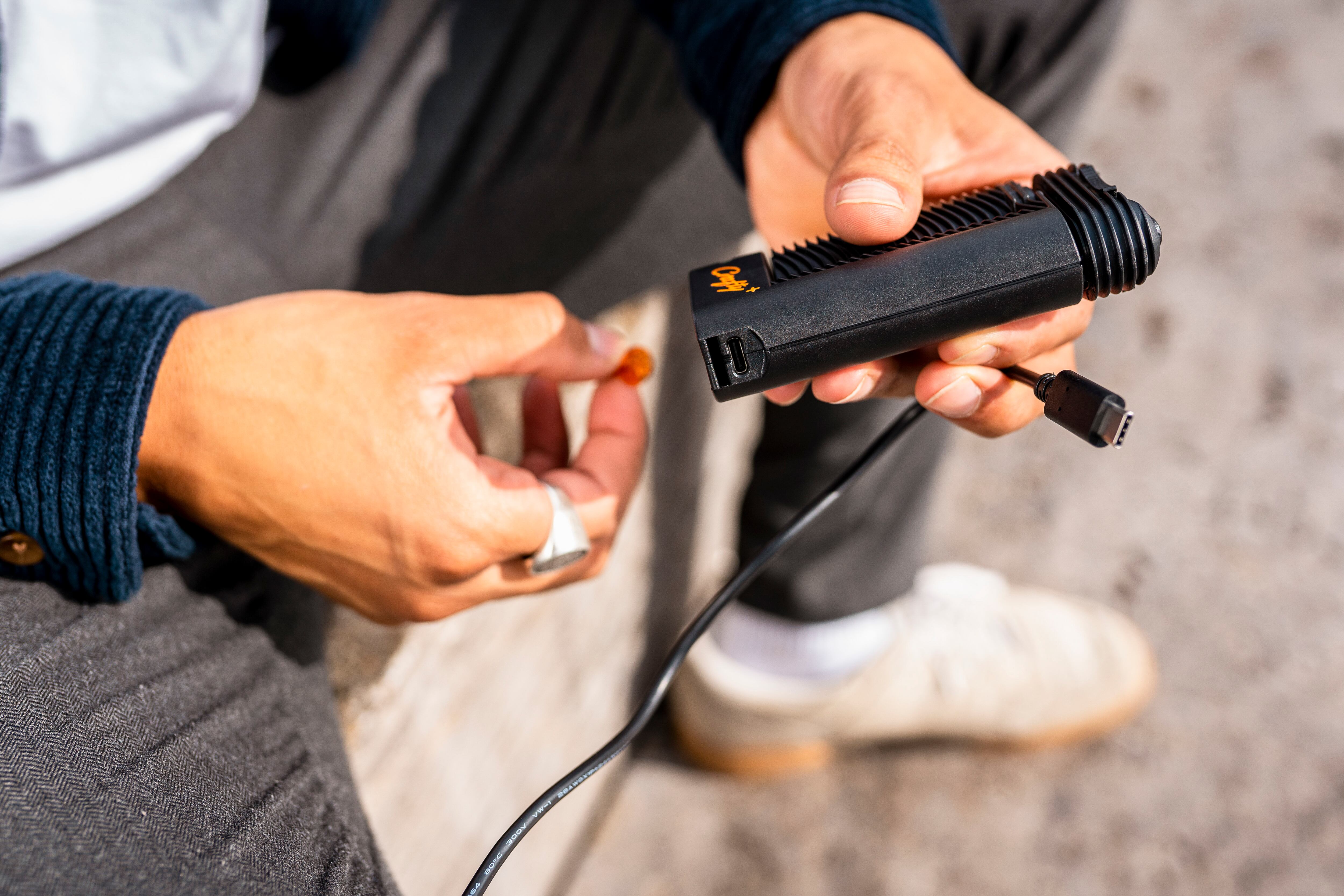 2)バーンオフフサイクル(空焚き)を実行するために、本体横の電源ボタンを長押しして電源を入れます。ハーブは入れません。180Cに温度が到達すると、ランプが赤い点灯から緑に変わります。オレンジ色のボタンをもう一度押して、本体を「ブースト」モードにすると、再び加熱され、今度は200Cになります。ライトが再度緑に変わったら、1分間放置し、自動的に電源が切れます。これは生産時に残った可能性のある薬品やゴミを燃焼するための行程です。